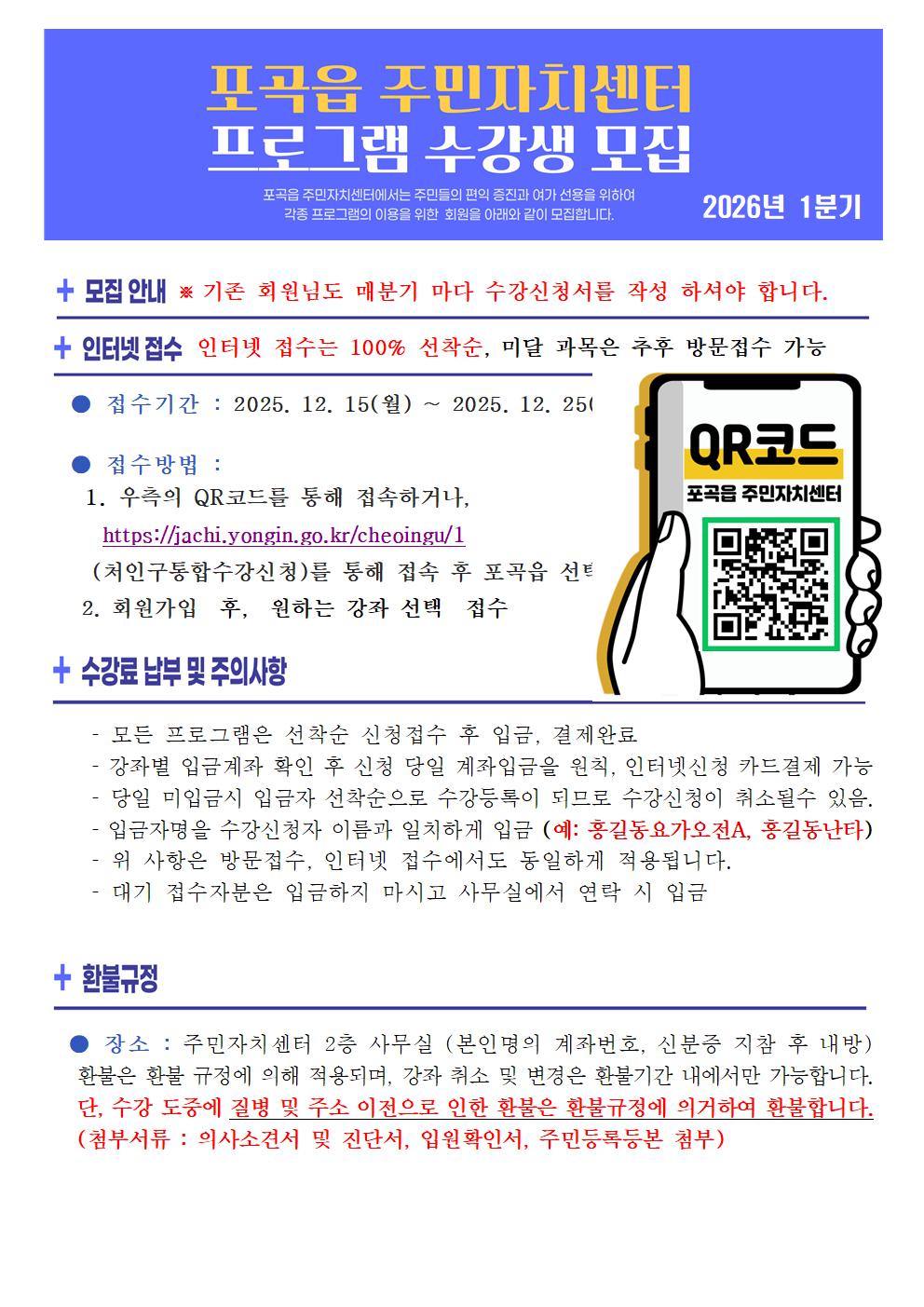 2026년 1분기 포곡읍 주민자치센터 수강생 모집 안내 (12월 15일 접수 시작)